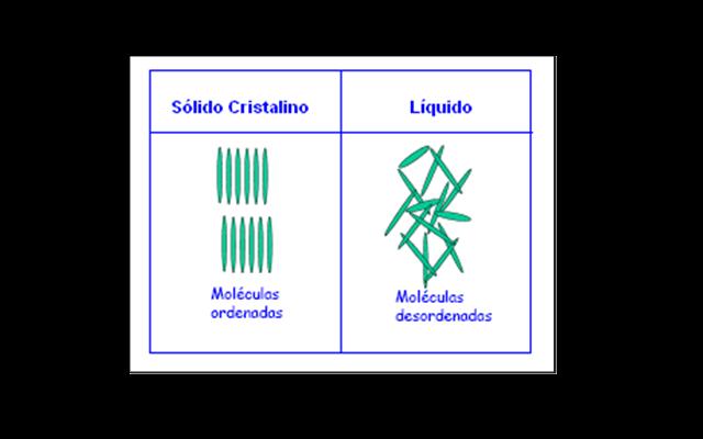 As moléculas dos cristais líquidos, diferentemente dos líquidos comuns, dispõem-se de forma ordenada, como no estado sólido, mas essa ordem molecular não é tão perfeita quanto aquela encontrada nos sólidos cristalinos. Os cristais líquidos também apresentam anisotropia (suas propriedades variam com a direção) como os sólidos.