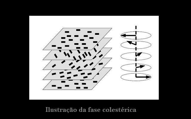 iii)Colestéricos:Apesar do colesterol não formar cristal líquido, alguns de seus derivados químicos o fazem e recebem essa denominação As moléculas dispõem-se em camadas, sendo que, dentro de cada uma dessas camadas, a estrutura é similar à dos cristais líquidos nemáticos. A direção média (direção n) das moléculas de uma camada está deslocada de certo ângulo em relação àquela das camadas vizinhas, de forma que essa direção varia periodicamente ao longo de um eixo perpendicular às camadas, ou seja, as moléculas se torcem ligeiramente a partir de uma camada até a próxima, resultando em uma espiral. Por isso, esta fase colestérica também é conhecida como nemática quiral ou nemática torcida.